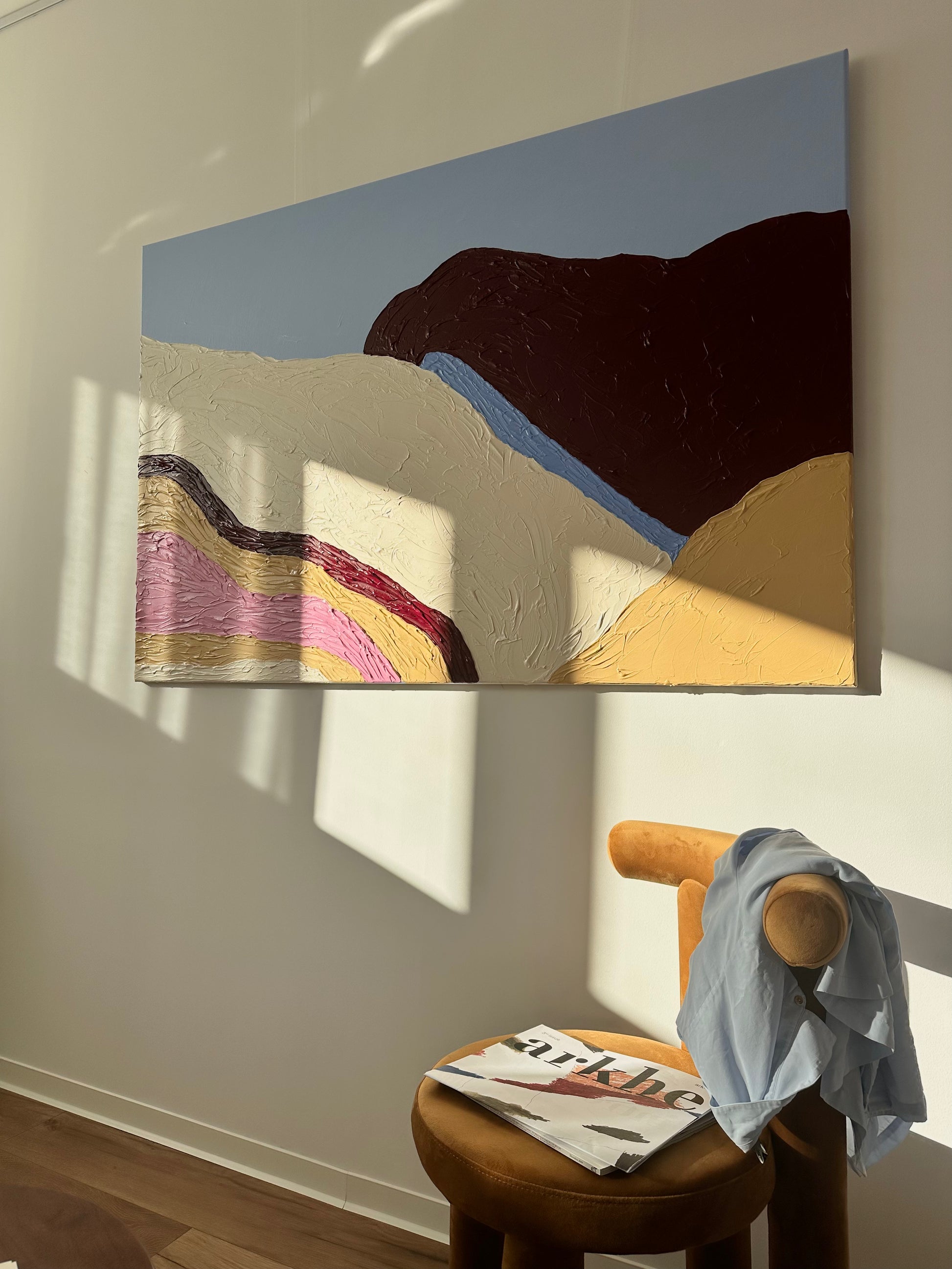 Meka creates her artwork using the 'thick-paint' technique, where acrylic paint is applied to the canvas in thick layers using a spatula. Meka is fascinated by the harmony of colors. Prefers clearly defined colors separated from each other. Each layer has its own, defined place. Her favorite subject is nature such as mountains, plants, animals partially combined with abstract elements.